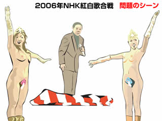 紅白歌合戦(2006年) DJ OZMA 女性ダンサーが裸そっくりのスーツで股間にキノコ。同時配信のアメリカは海の写真に、韓国ではモザイクがw