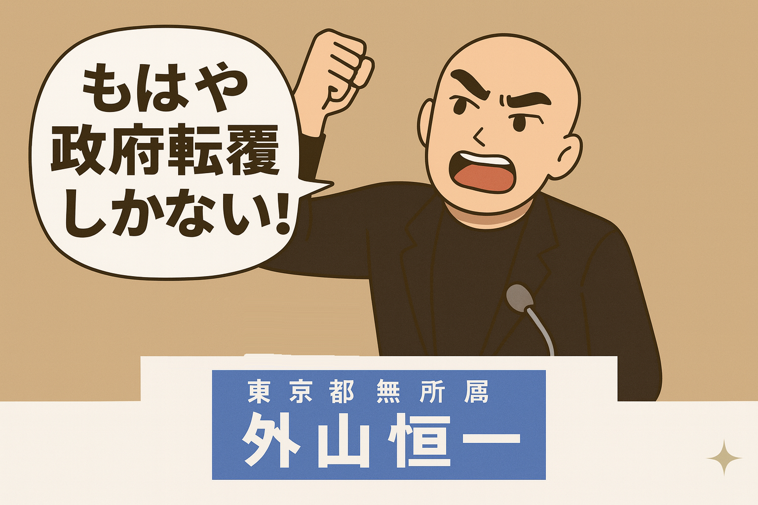 (ナレーション)東京都知事候補 無所属 外山恒一 36歳反管理教育運動を出発点に、異端的極左活動家となり、今時、政治犯として2年投獄され、現在に至るも、反体制知識人。では続いて外山恒一さんの政見放送です。 (いきなり左肘をつく) 有権者諸...