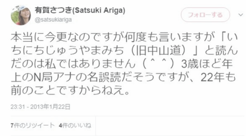 世間では「有賀さつきアナ」というデマがながれていましたが、有賀さんがこのようにツイートされていました。